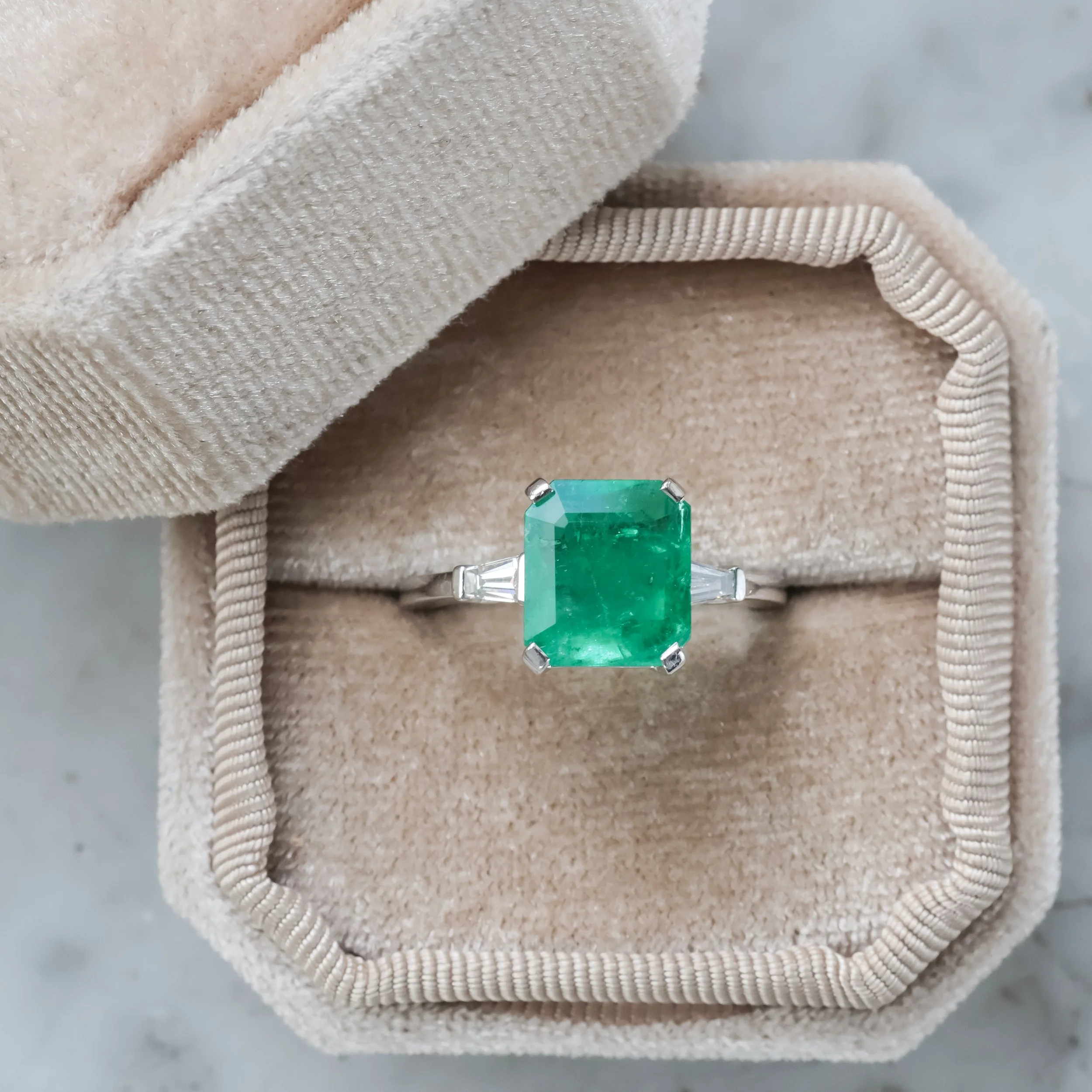 Ravissante bague contemporaine en platine, ornée en son centre d’une émeraude de Colombie de taille rectangulaire à pans coupés, d’un poids estimé à environ 2,60 carats, épaulée de deux diamants taille trapèze totalisant environ 0,10 carat.